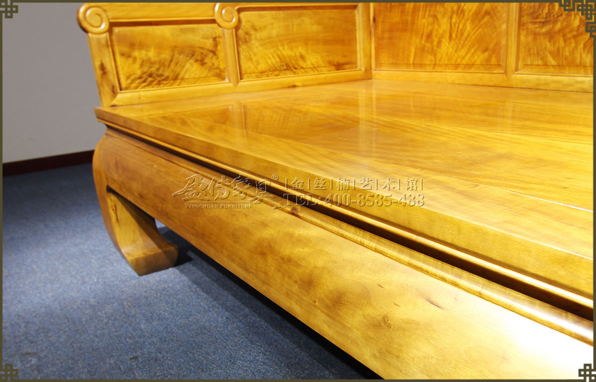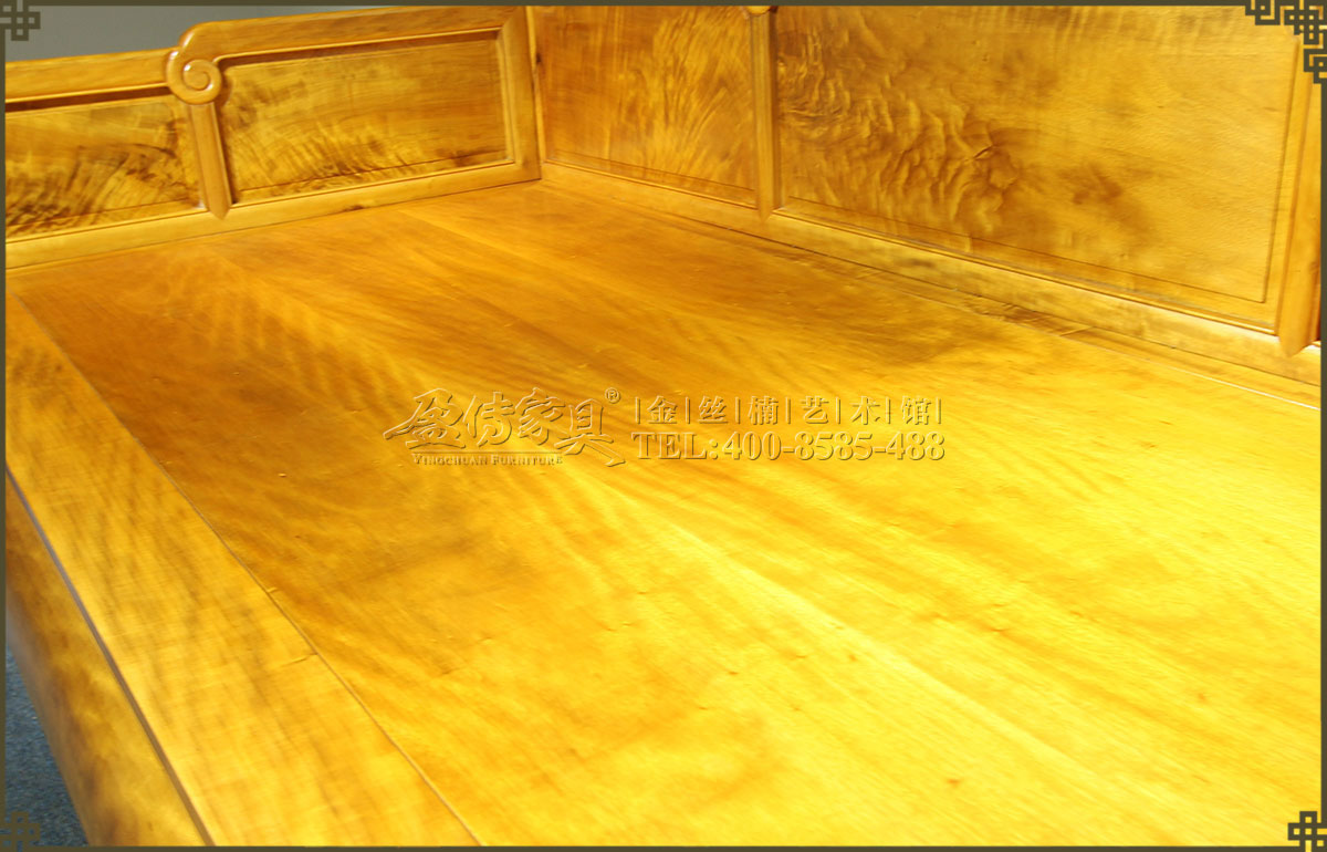 此金絲楠羅漢床最?yuàn)Z目的是七塊圍板都滿布金絲,如水波似云彩,云龍交匯,造型生動(dòng),層次豐富,移步換景,各個(gè)角度看都令人震撼,猶如一幅幅天然的藝術(shù)畫,美輪美奐。