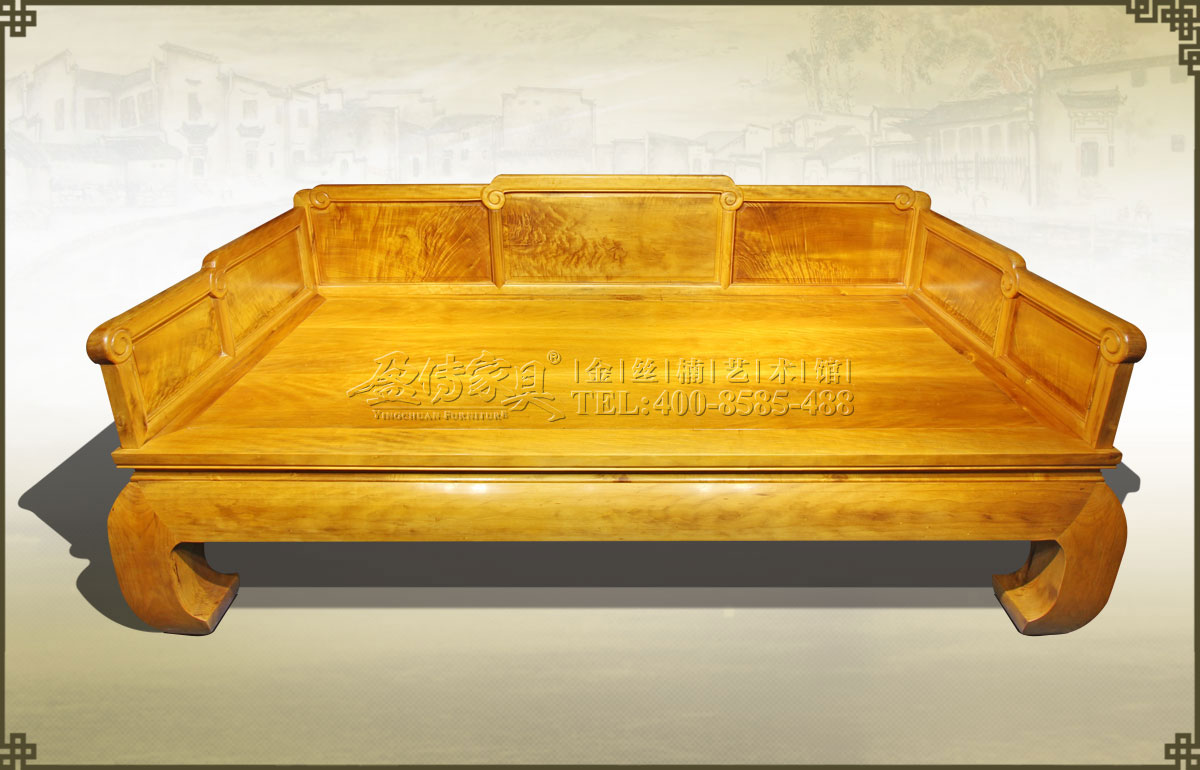 羅漢床床面光滑平整,遍布虎皮紋,大氣威武,扶手靠背部位階梯造型,象征步步高升。四腿采用內(nèi)翻馬蹄足,沉穩(wěn)厚實(shí),雄壯有力。