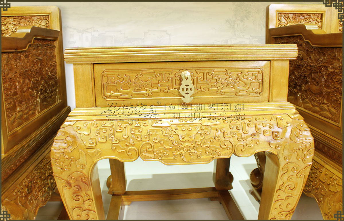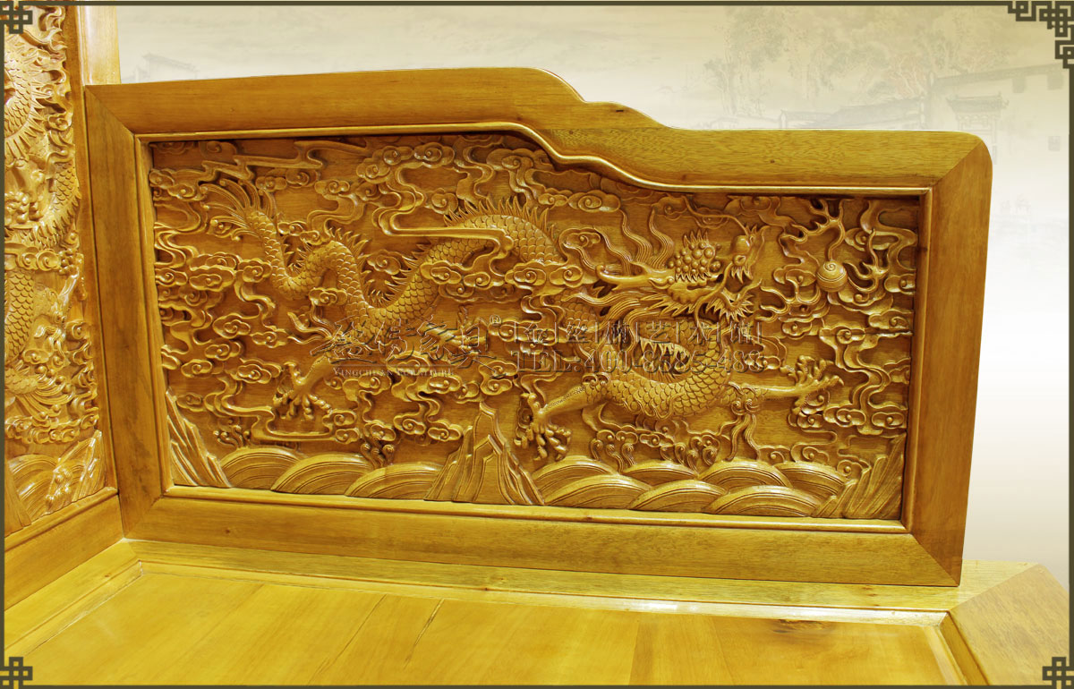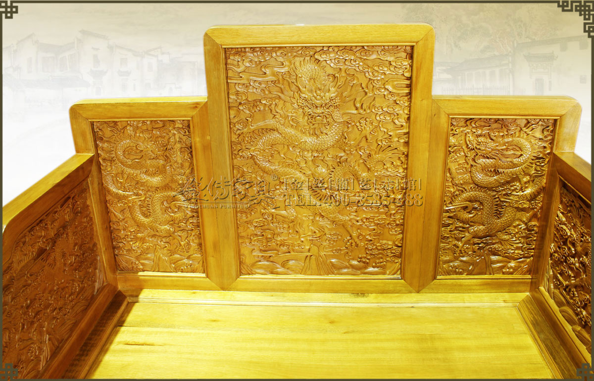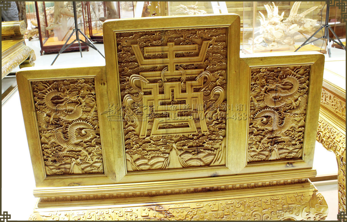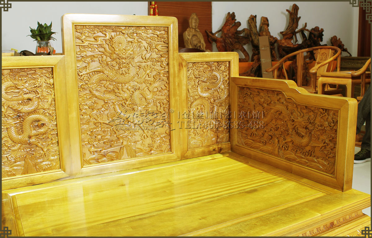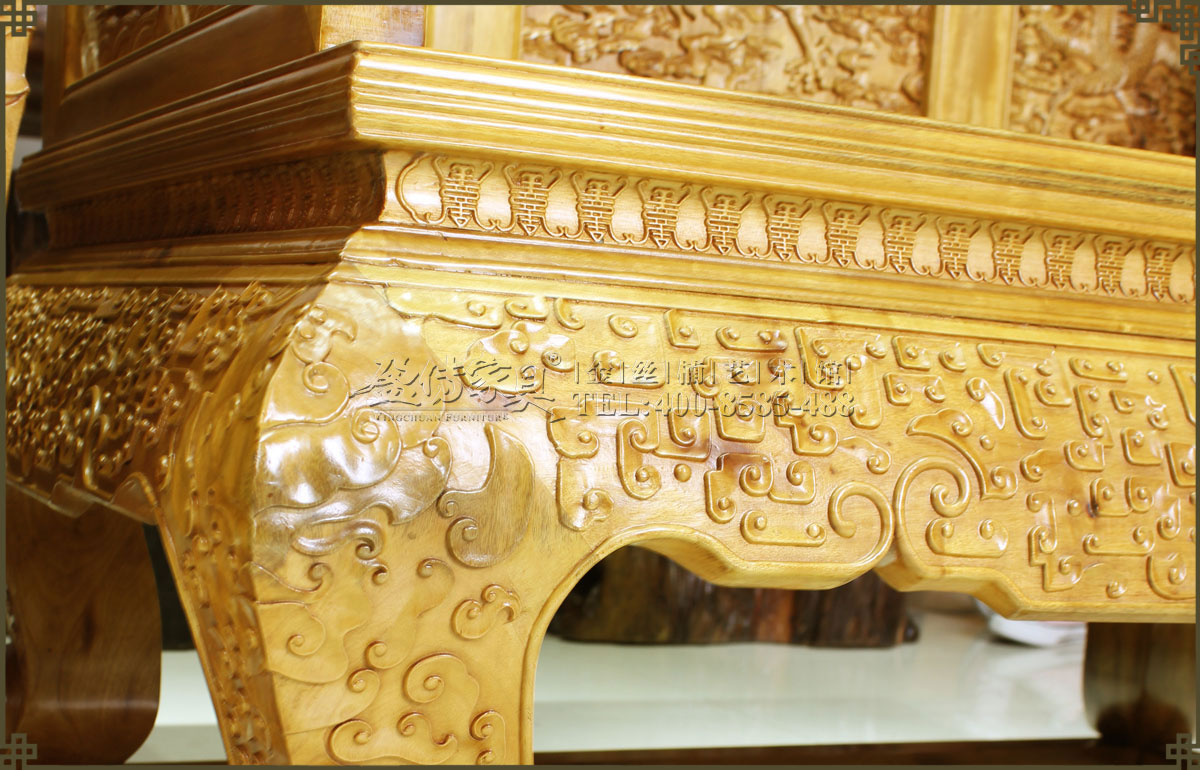 此大寶座是清代皇家家具圖譜的款式,工藝要求極其復雜,五屏風式座圍,周身滿工,內外均浮雕云龍紋,雕琢精細流暢,紋飾既威嚴神圣又絢麗生動,富麗華貴,大氣大派,唯我獨尊,極具皇家風范,此乃權力和財富的象征也,有著很高的收藏價值、欣賞價值。