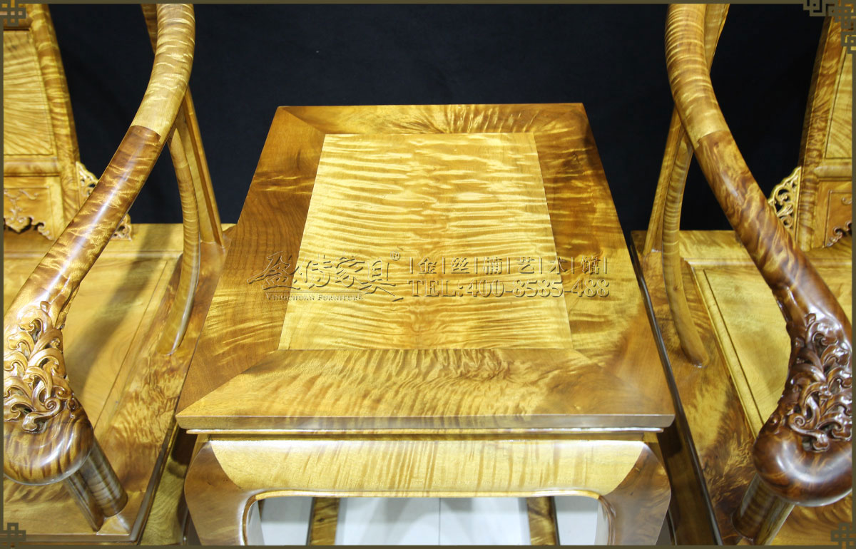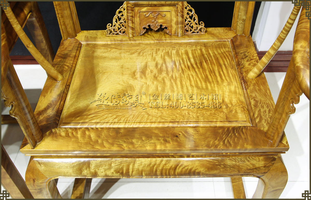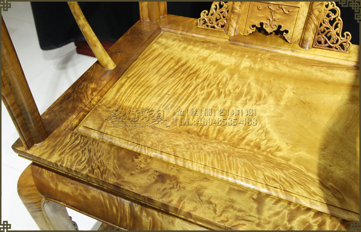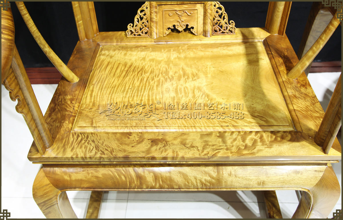 此皇宮椅三件套最大特點是有著震撼人心的滿水波紋路,富麗堂皇,流光溢彩,大氣磅礴,移步換景,像波光粼粼的水浪、像連綿不絕的山峰、像絢爛多變的云彩,縈繞著濃烈的富麗氣質,沿襲皇家風范,彰顯高貴品質,大氣之感撲面而來,讓人心靈完全被深深地折服。