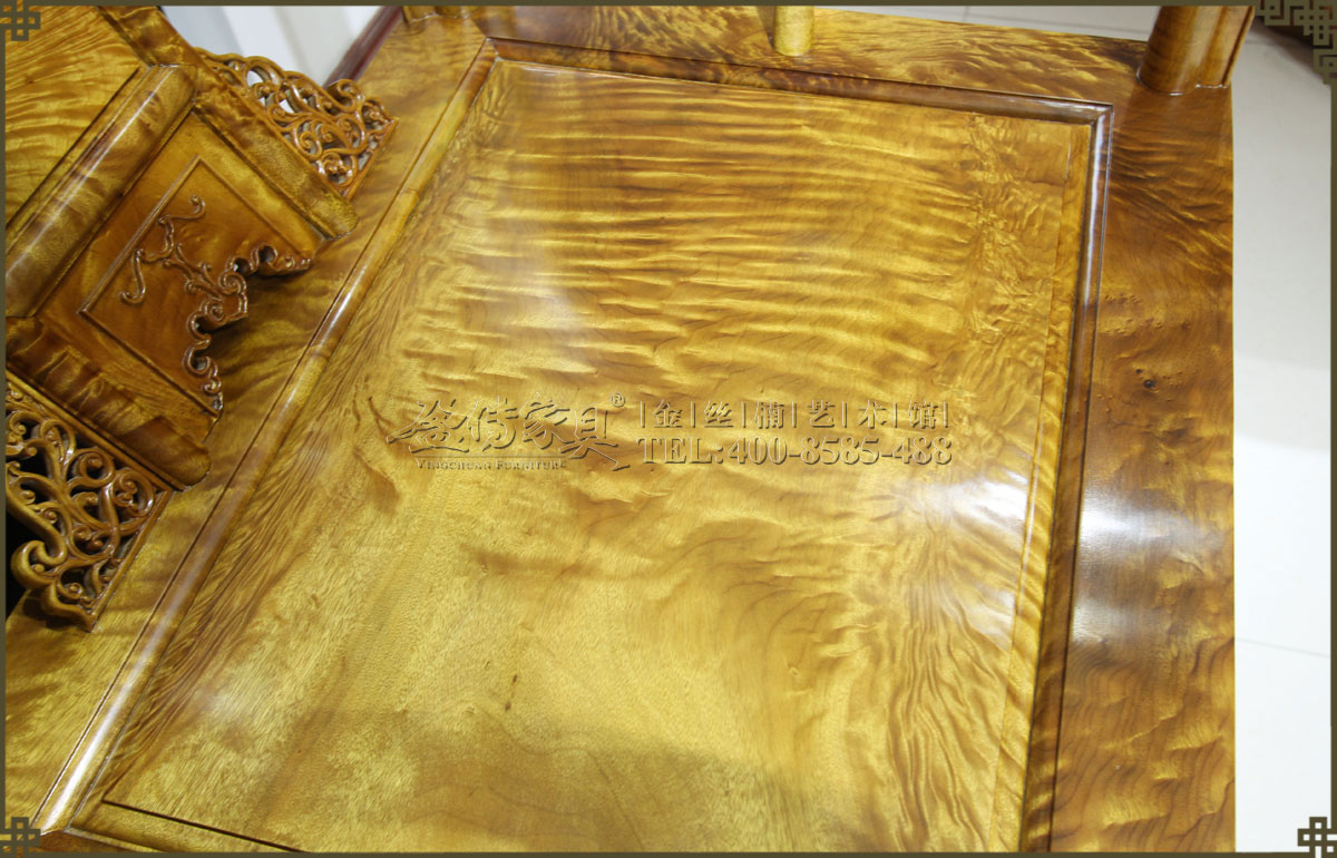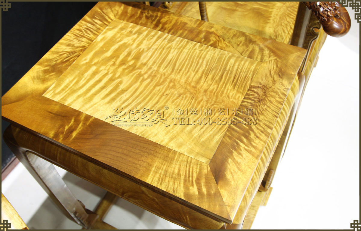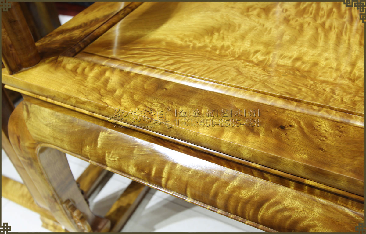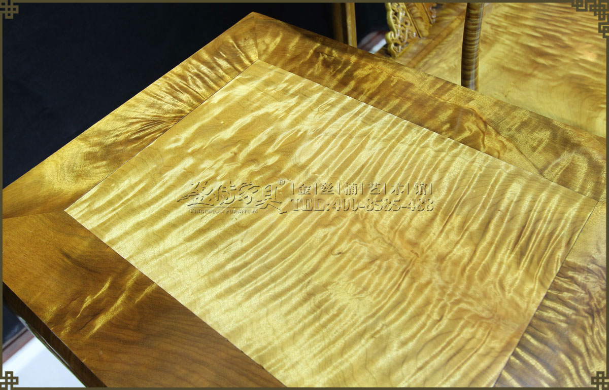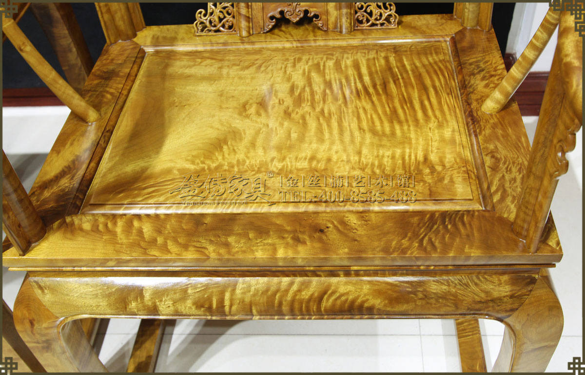 此皇宮椅三件套最大特點是有著震撼人心的滿水波紋路,富麗堂皇,流光溢彩,大氣磅礴,移步換景,像波光粼粼的水浪、像連綿不絕的山峰、像絢爛多變的云彩,縈繞著濃烈的富麗氣質,沿襲皇家風范,彰顯高貴品質,大氣之感撲面而來,讓人心靈完全被深深地折服。