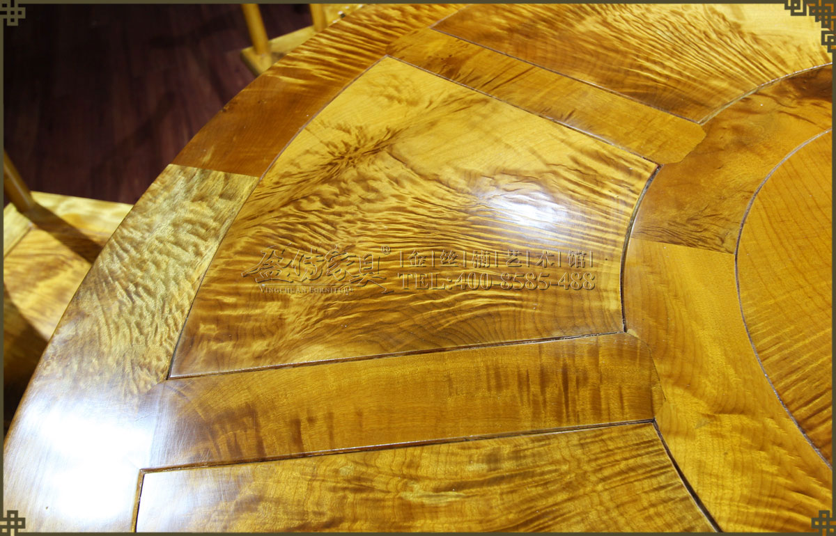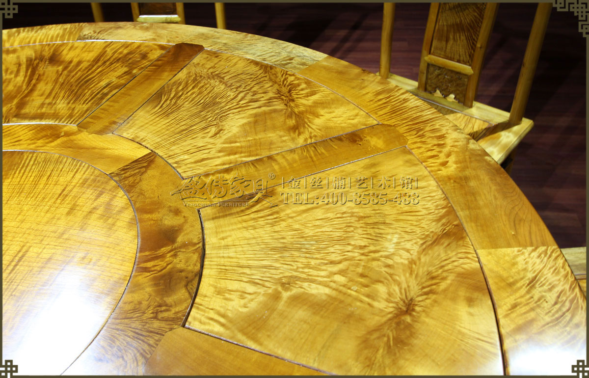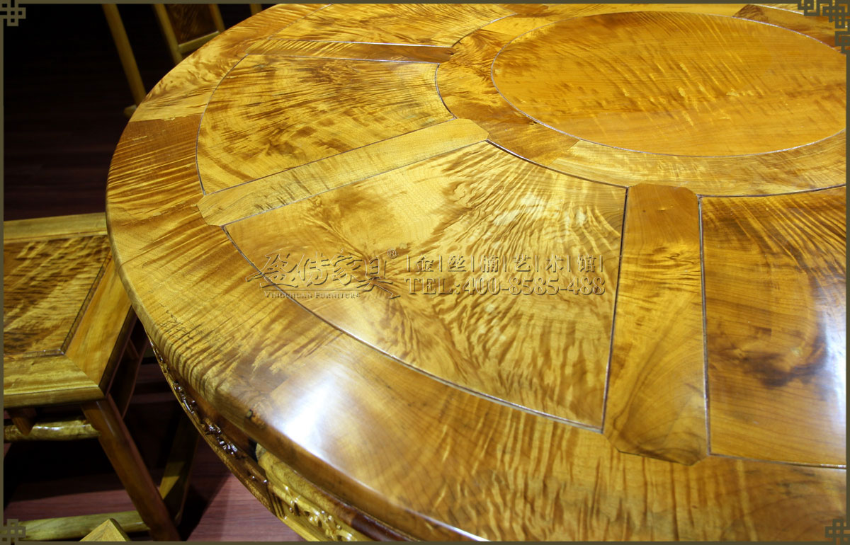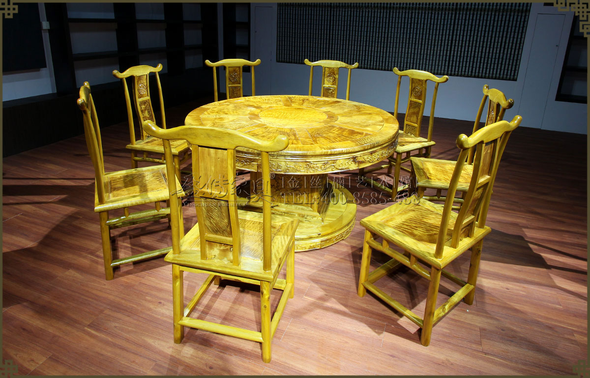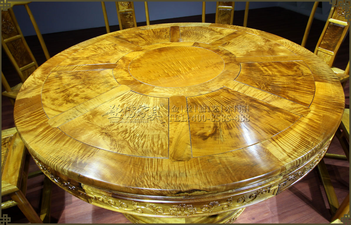 氣派、豪華的滿波紋路金絲楠大圓餐臺9件套。整個桌面和所有的椅面都布滿密集、立體、清晰的水波紋,熠熠生輝,金碧輝煌,讓你用餐前先享受視覺盛宴,美得驚人,具有極高的收藏價值和藝術欣賞價值!放于家中、會所、酒店招待客人,尤其體面,必定令人驚訝務必,一見難忘,嘖嘖稱贊。