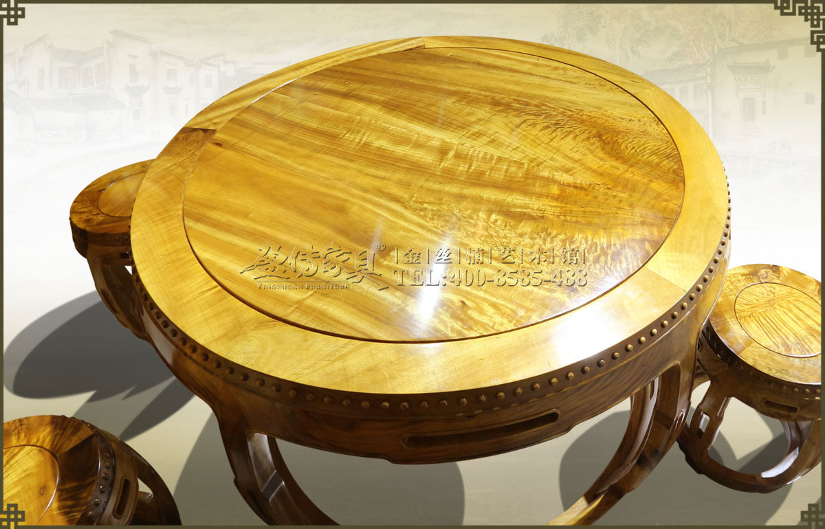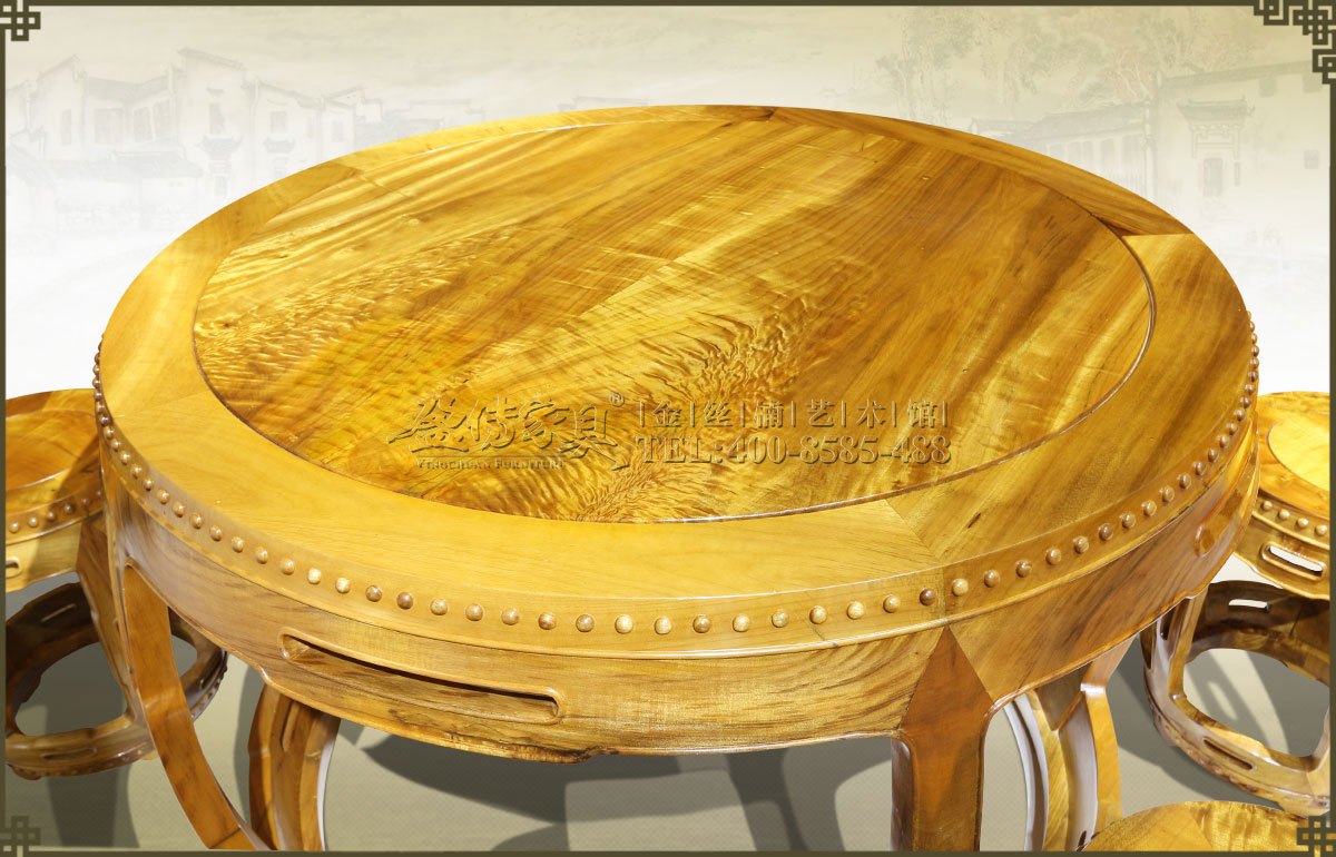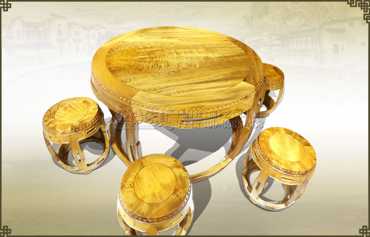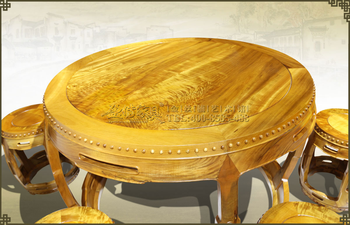 一大圓桌,配6個5開光鼓凳。線條流暢,古色古香,簡潔高雅,在審美情趣上給人以圓融豁達的心態(tài)。在使用上可以多用,兼具餐桌、茶桌、牌桌、洽談桌等多個功能,在這樣高雅的金絲楠圓臺上用餐喝茶,足享人生的快樂。