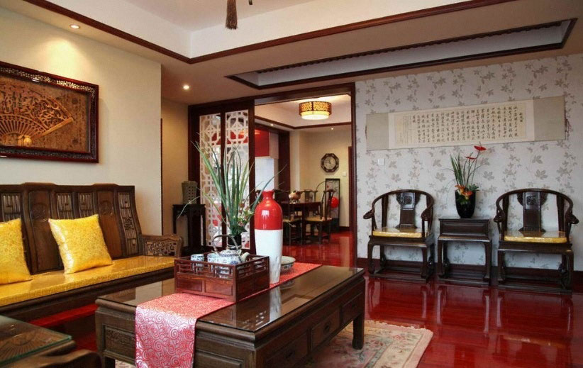當現在與中式古典相遇,必然會摩擦異樣的火花,黑、白、紅在現代空間的結合里孕育出新中式的別樣味道。在空間造型上多采用簡潔的直線描繪,中式花格、壁畫、墻紙與紅木家具的協調搭配...